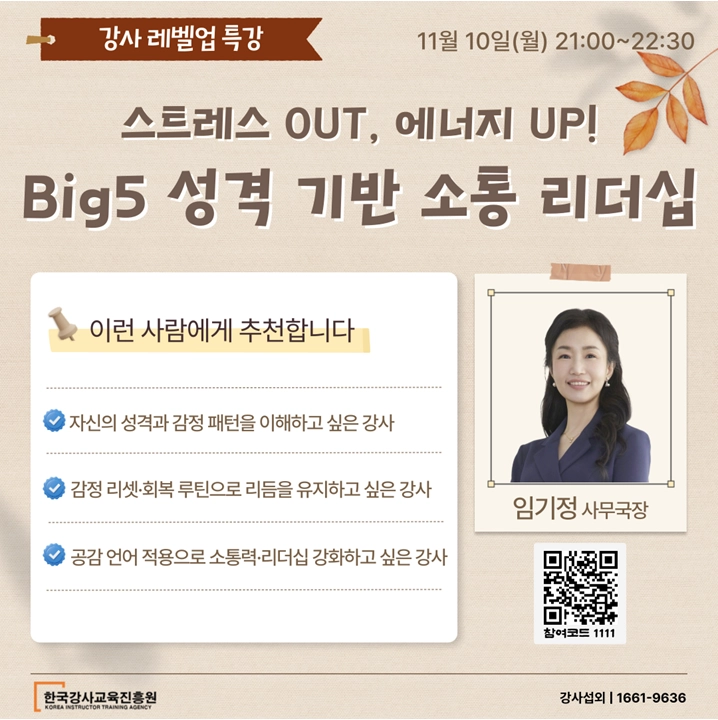 ๐11/10(์) ์คํธ๋ ์ค OUT, ์๋์ง UP! Big5 ์ฑ๊ฒฉ ๊ธฐ๋ฐ ์ํต ๋ฆฌ๋์ญ
