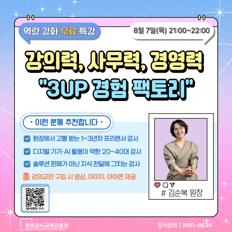 ๐8/7(๋ชฉ) ๊ฐ์ฌ์ ๋ ๋ฒจ์ ์ฌ๋ฆฌ๋ ๊ฐ์๋ ฅ ์ฌ๋ฌด๋ ฅ ๊ฒฝ์๋ ฅ "3UP ๊ฒฝํ ํฉํ ๋ฆฌ"