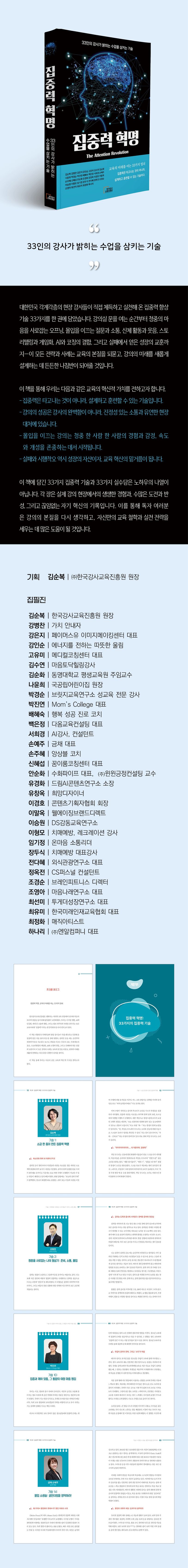 대한민국 각계각층의 현장 강사들이 직접 체득하고 실천해 온 집중력 향상 기술 33가지를 한 권에 담았다. 강의실 문을 여는 순간부터 청중의 마음을 사로잡는 오프닝, 몰입을 이끄는 질문과 소통, 신체 활동과 웃음, 스토리텔링과 게임화, AI와 코칭의 결합, 그리고 실패에서 얻은 성장의 교훈까지-이 모든 전략과 사례는 교육의 본질을 되묻고, 강의의 미래를 새롭게 설계하는 데 든든한 나침반이 되어줄 것이다.